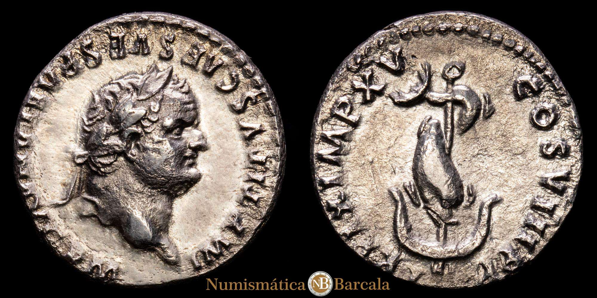 Tito. Denario. 89 d.C. Roma. (Ric-112). (Bmcre-72). (Rsc-309). Anv.: IMP TITVS CAES VESPASIAN AVG P M. Cabeza laureada a derecha. Rev.: TR P IX IMP XV COS VIII P P. Delfín enrollado alrededor de ancla. Ag. 3,25 g. Bonita pátina. MBC+.