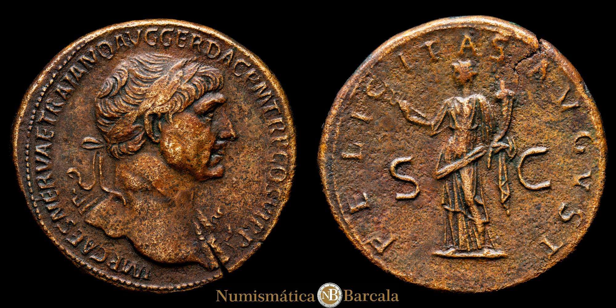 TRAJANO. 98-117 d. C. Æ Sestercio (25,36 g). Srruck 112-114 d. C. Busto laureado a la derecha, drapeado en el hombro izquierdo / Felicitas de pie a la izquierda, sosteniendo caduceo y cornucopia. RIC II 625; BMCRE 964 var. Cohen 144. superficies marrones. VF+.