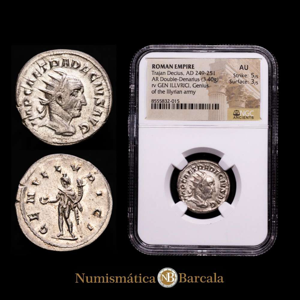 Numismática Barcala > Productos > Trajano Decio. 249-251 d. C. Antoniniano de plata (21,5 mm, 3,40 g). Roma, 2.ª officina. 6.ª emisión, 251 d. C. RIC IV 38b; RSC 44. Encapsuldo por NGC como AU Strike: 5/5, Surface: 3/5.