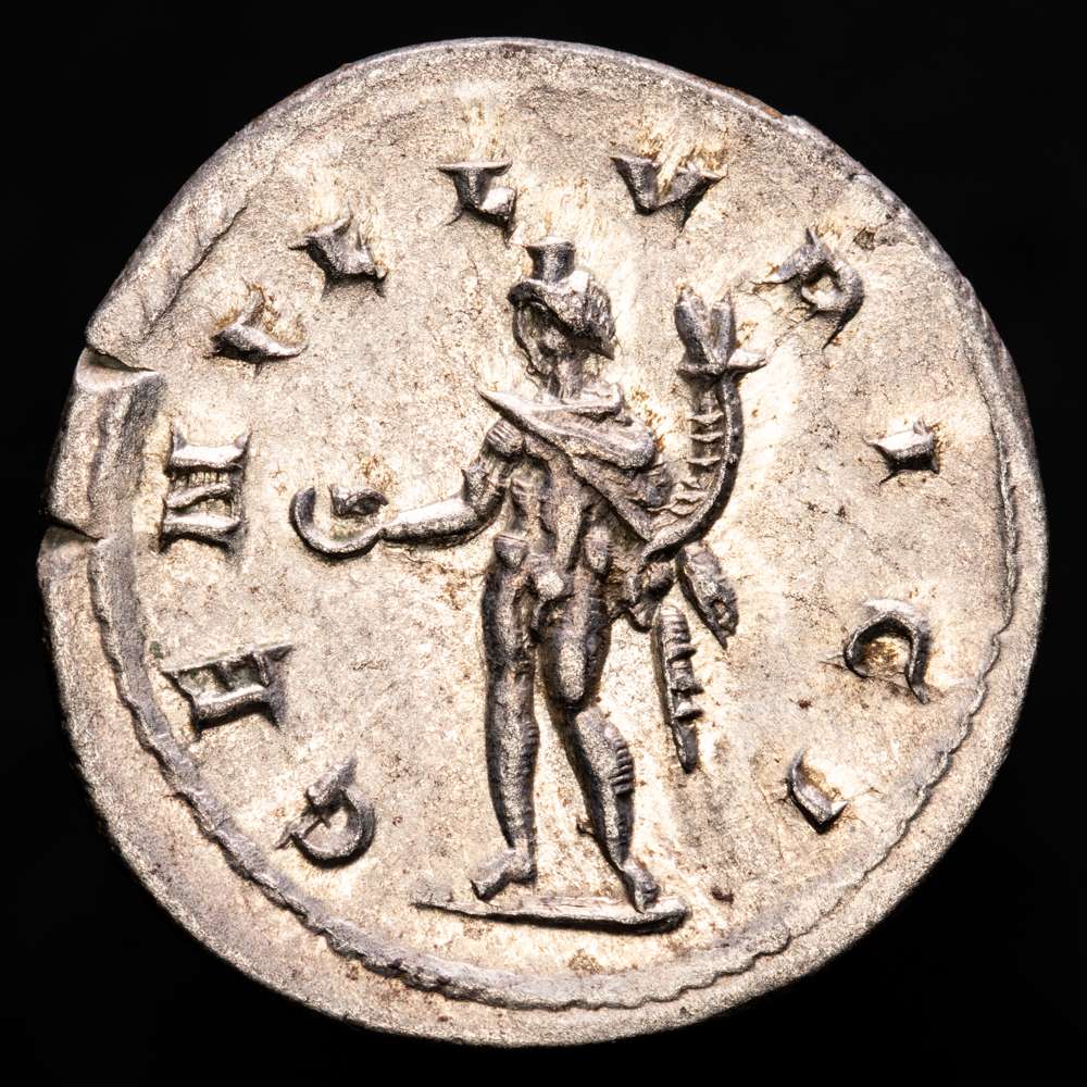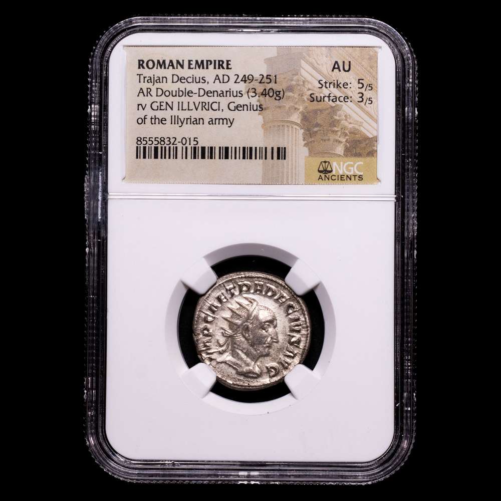 Numismática Barcala > Productos > Trajano Decio. 249-251 d. C. Antoniniano de plata (21,5 mm, 3,40 g). Roma, 2.ª officina. 6.ª emisión, 251 d. C. RIC IV 38b; RSC 44. Encapsuldo por NGC como AU Strike: 5/5, Surface: 3/5.