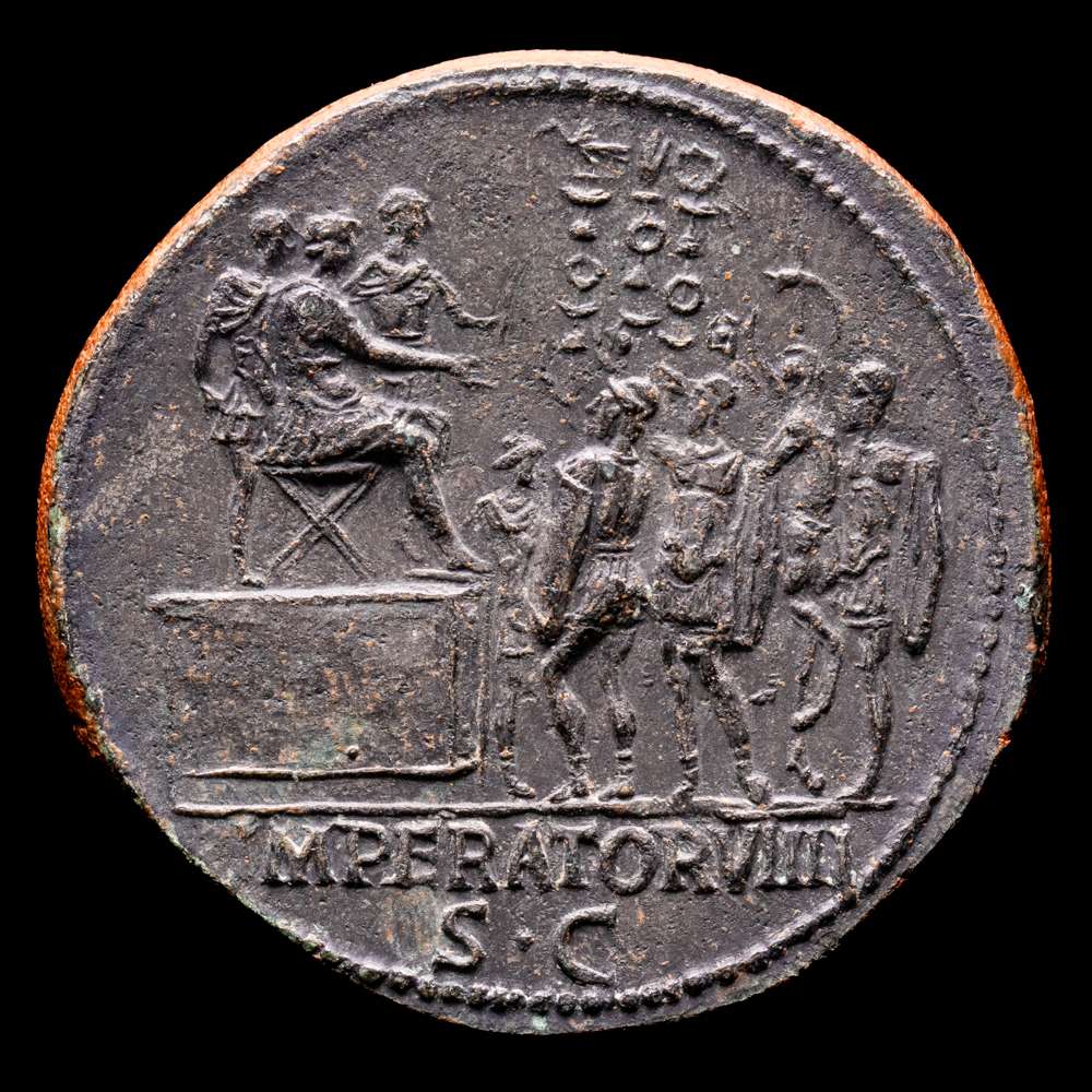 Numismática Barcala > Productos > TRAJANO. Sestercio. Roma (114-117). Æ (27,58 g 35mm). RIC 658. Extremadamente fino; Una composición del reverso muy interesante y finamente detallada, atractiva pátina marrón. Muy raro.