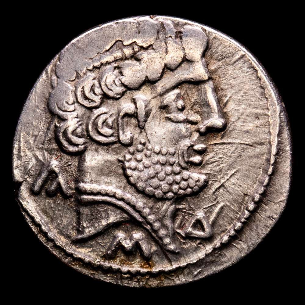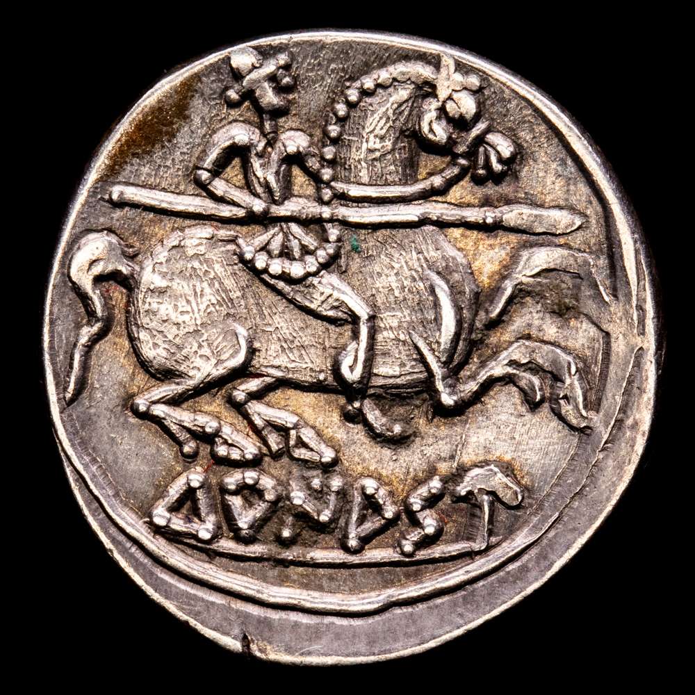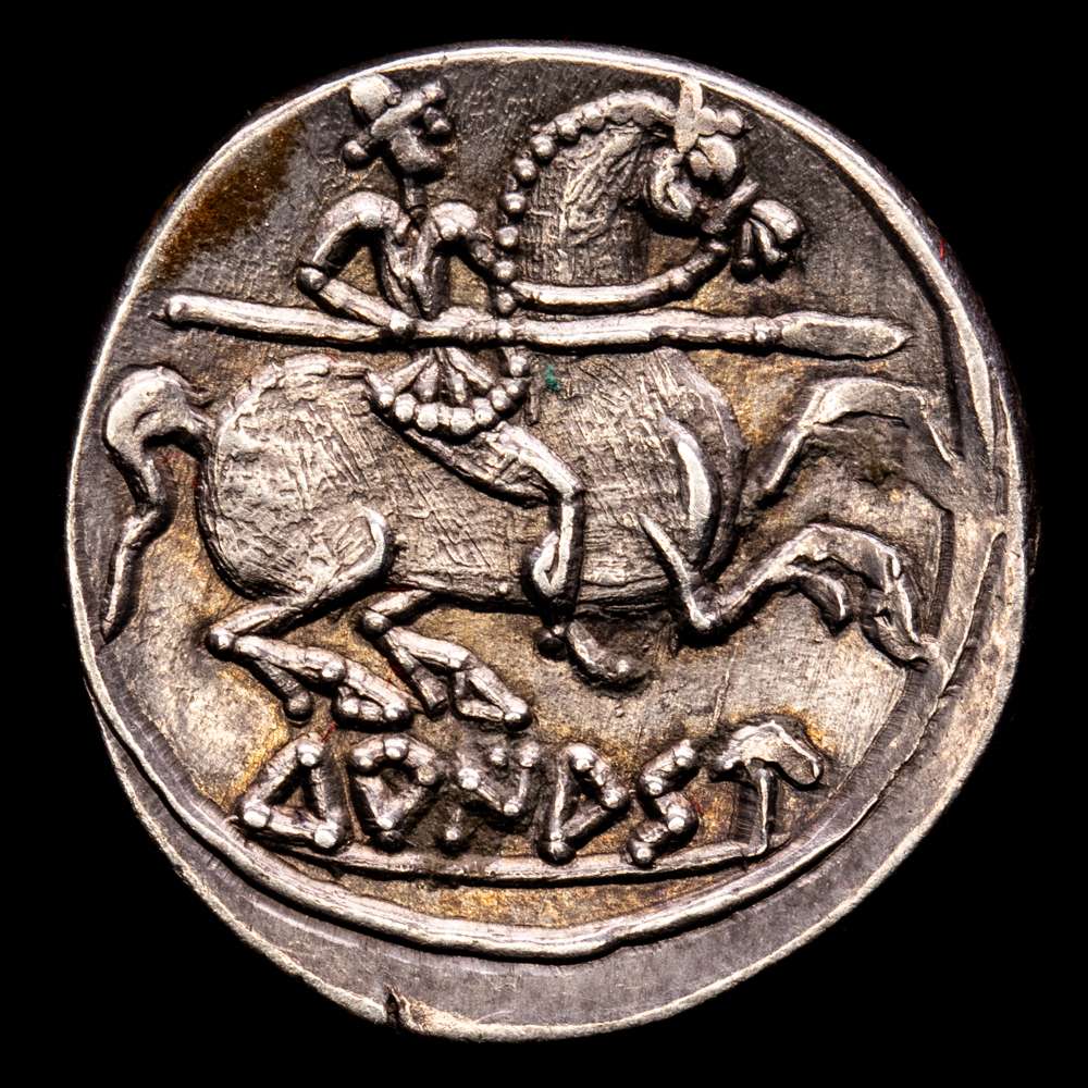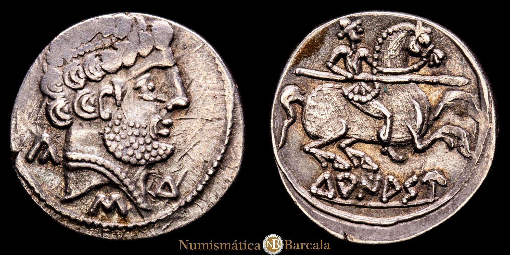 Turiasu. Denario. 120-20 a.C. Tarazona (Zaragoza). (Abh-2417). (Acip-1720). (C-33). Anv.: Cabeza barbada a derecha con peinado en 2 niveles por encima de la oreja, alrededor KA, S y TU. Rev.: Jinete con lanza a derecha, con la patas traseras encogidas, debajo TURIASU. Ag. 3,65 grs. MBC+.