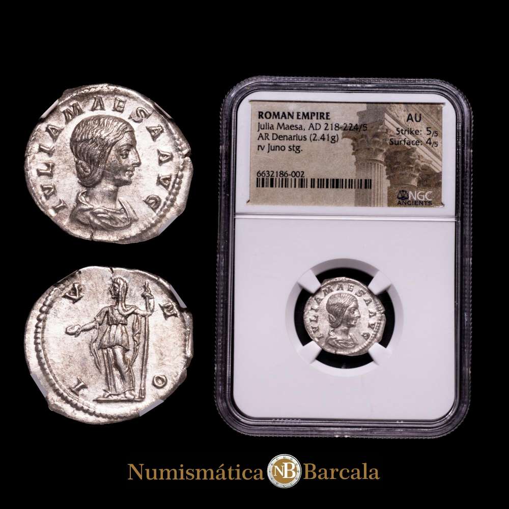 Julia Maesa. (218-224/5 d. C.). Denario AR (2,41 g, 6 h). NGC AU 5/5 – 4/5. Roma. IVLIA MAESA AVG, busto de Julia Mesa, con drapeado, a la derecha, cabello recogido en un gran moño en la nuca. IVNO, Juno de pie, mirando hacia la izquierda, con pátera en la mano derecha y cetro en la izquierda. RIC IV.II (Heliogábalo) 254.