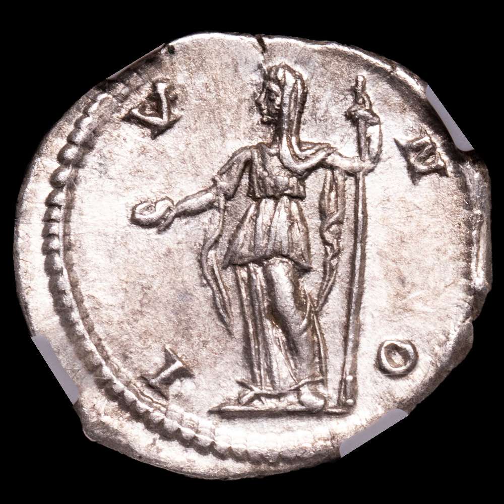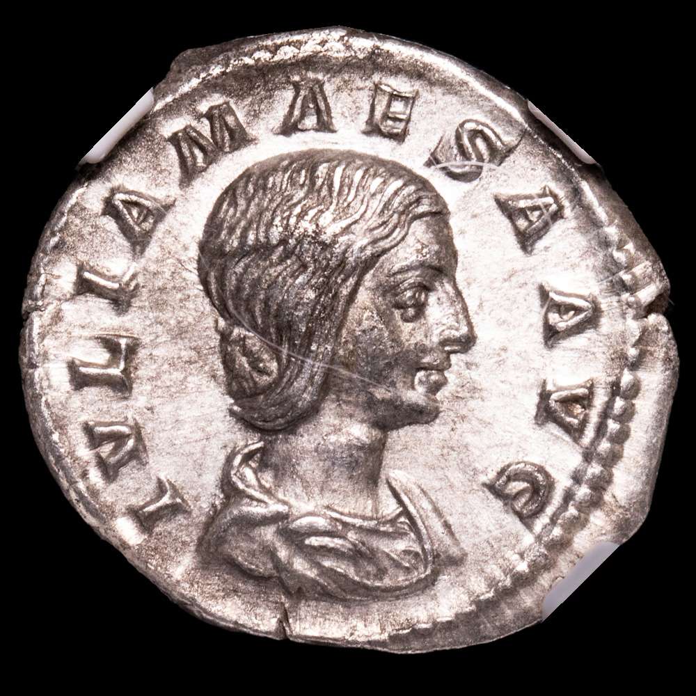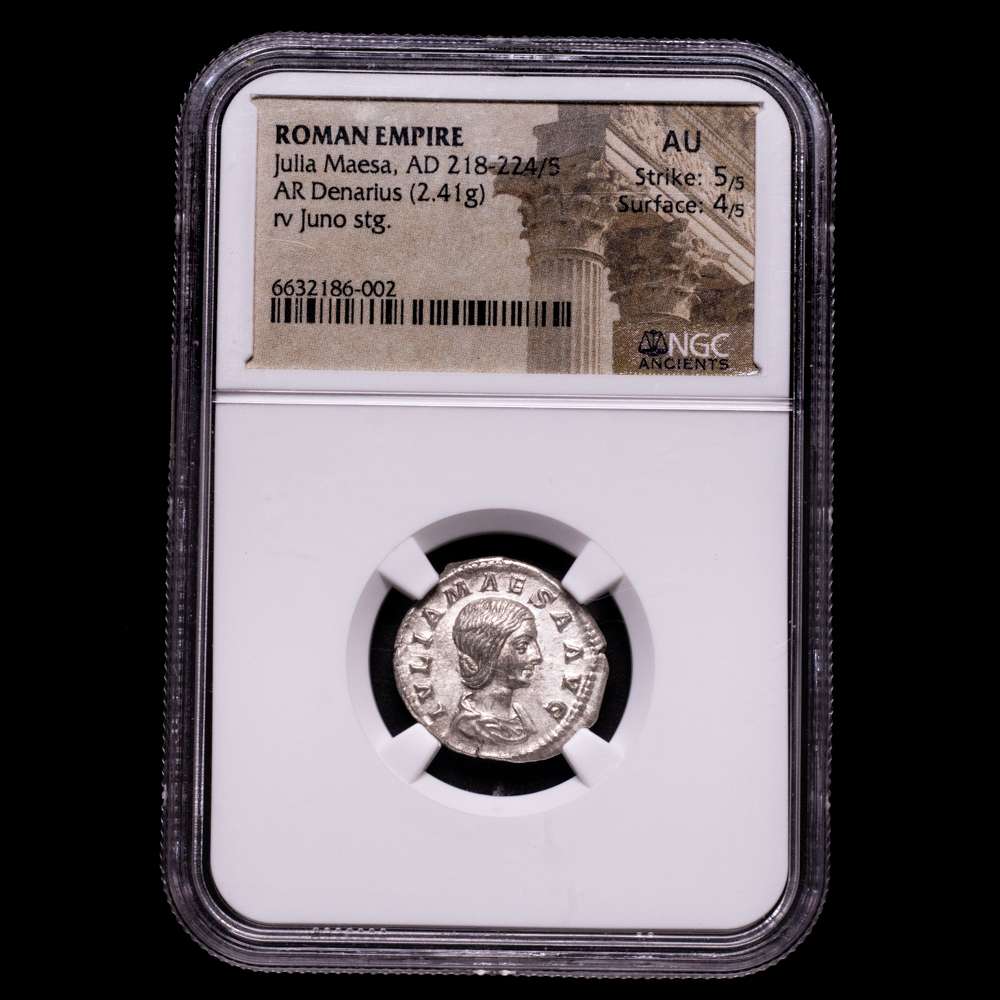 Julia Maesa. (218-224/5 d. C.). Denario AR (2,41 g, 6 h). NGC AU 5/5 – 4/5. Roma. IVLIA MAESA AVG, busto de Julia Mesa, con drapeado, a la derecha, cabello recogido en un gran moño en la nuca. IVNO, Juno de pie, mirando hacia la izquierda, con pátera en la mano derecha y cetro en la izquierda. RIC IV.II (Heliogábalo) 254.