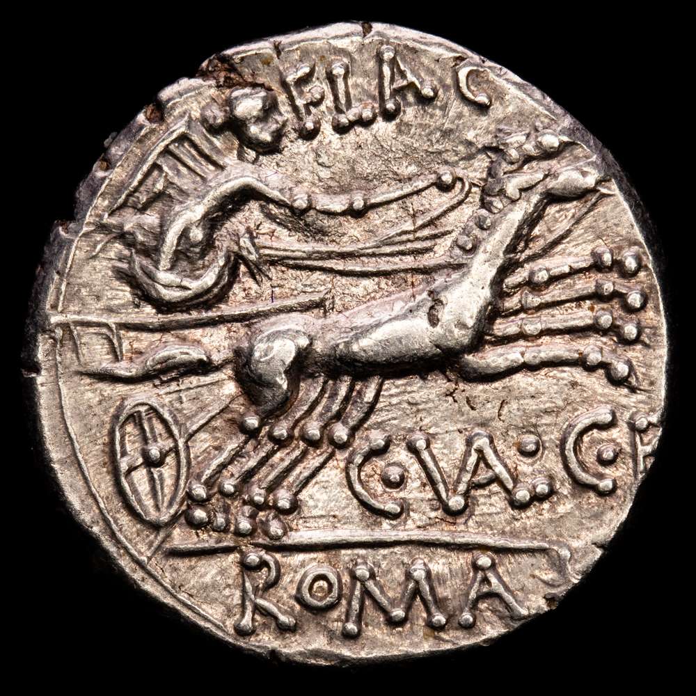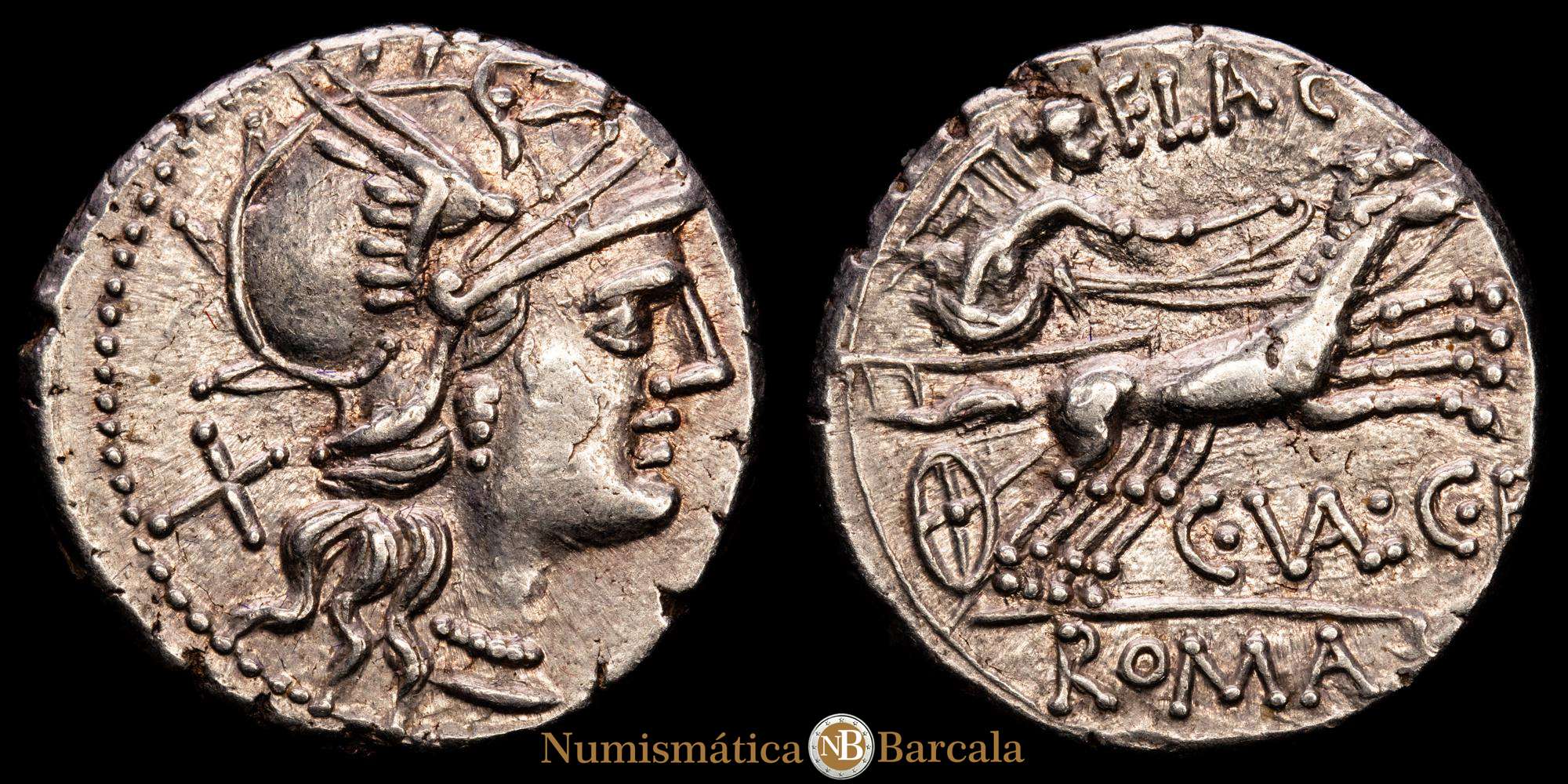 Valeria. C. Valerio Cf Flaco. Denario. 140 aC Roma. (Ffc-1163). (Craw-228/2). (Cal-1320). Anv.: Cabeza de Roma a derecha, detrás: X. Rev.: Victoria con látigo en biga a derecha, encima: FLAC., debajo: C. VAL. CF, (VAL entrelazadas), en el exergo: ROMA. Ag. 3,84 g. XF. Ligera pátina.