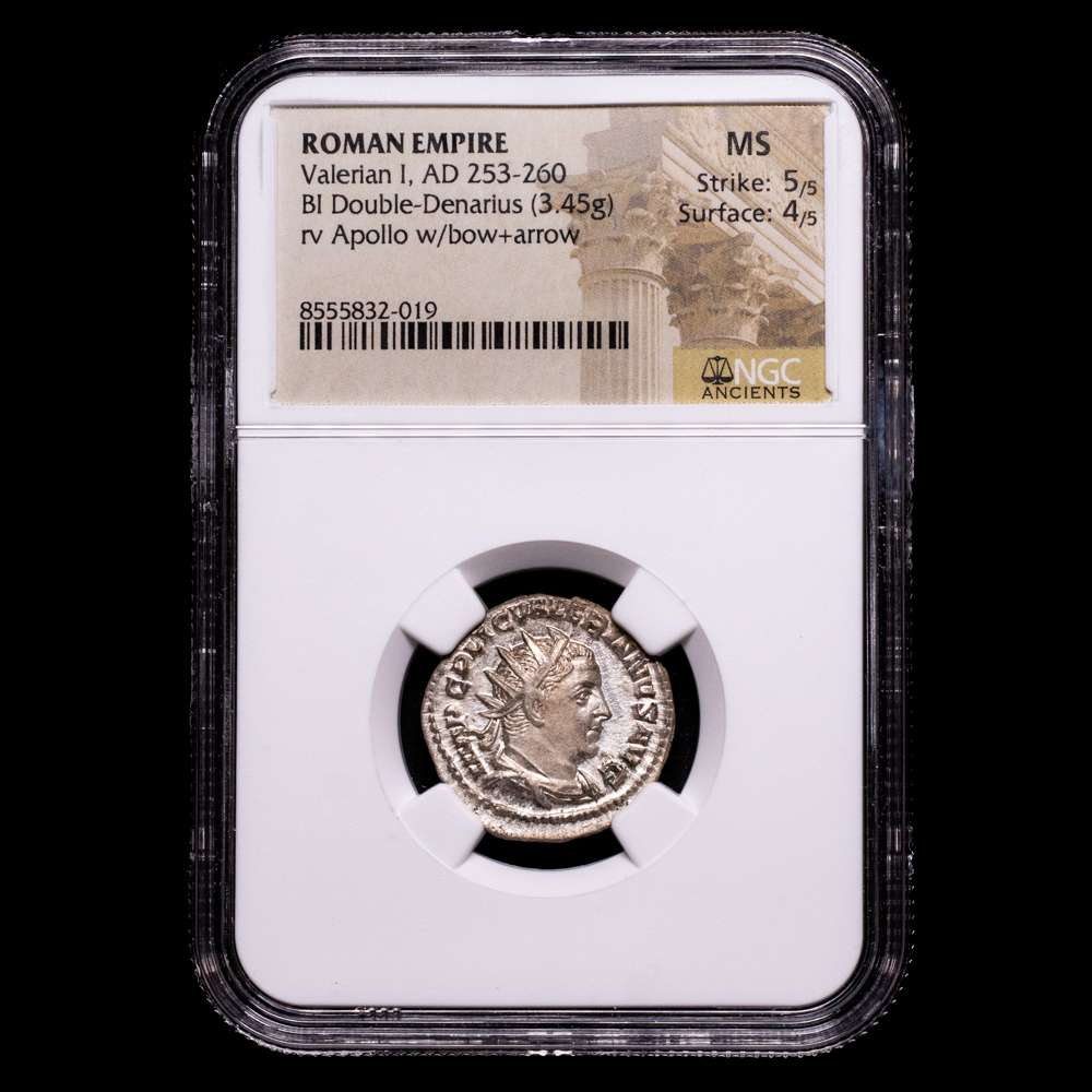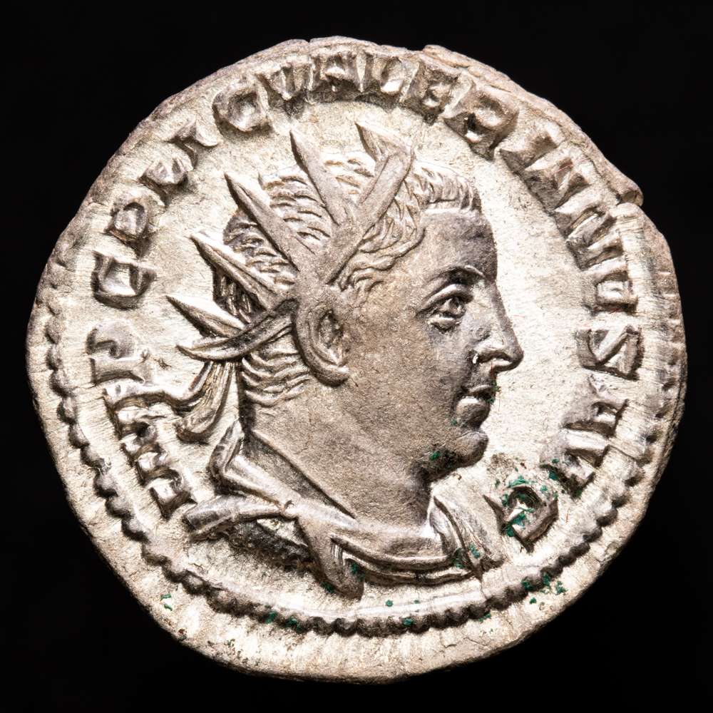 Valeriano I. 253-260 d. C. Antoniniano o doble denario de plata (21 mm, 3,45 g, 12 h). Ceca de Roma. Primera emisión, 253-254 d. C. Busto radiado, drapeado y con coraza a la derecha / Apolo de pie a la derecha, tensando el arco. RIC V 74; MIR 36, 44d; RSC 25. Excelente estado de conservación, con todo su brillo original.