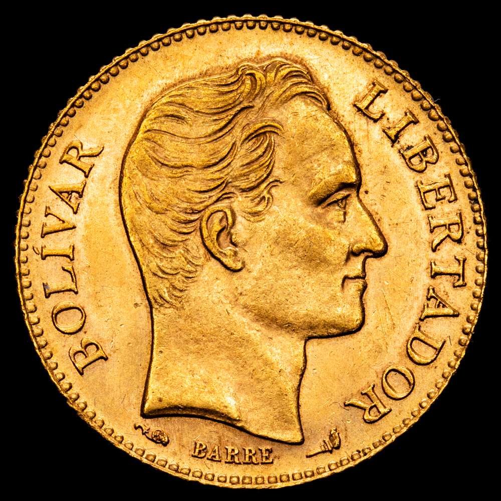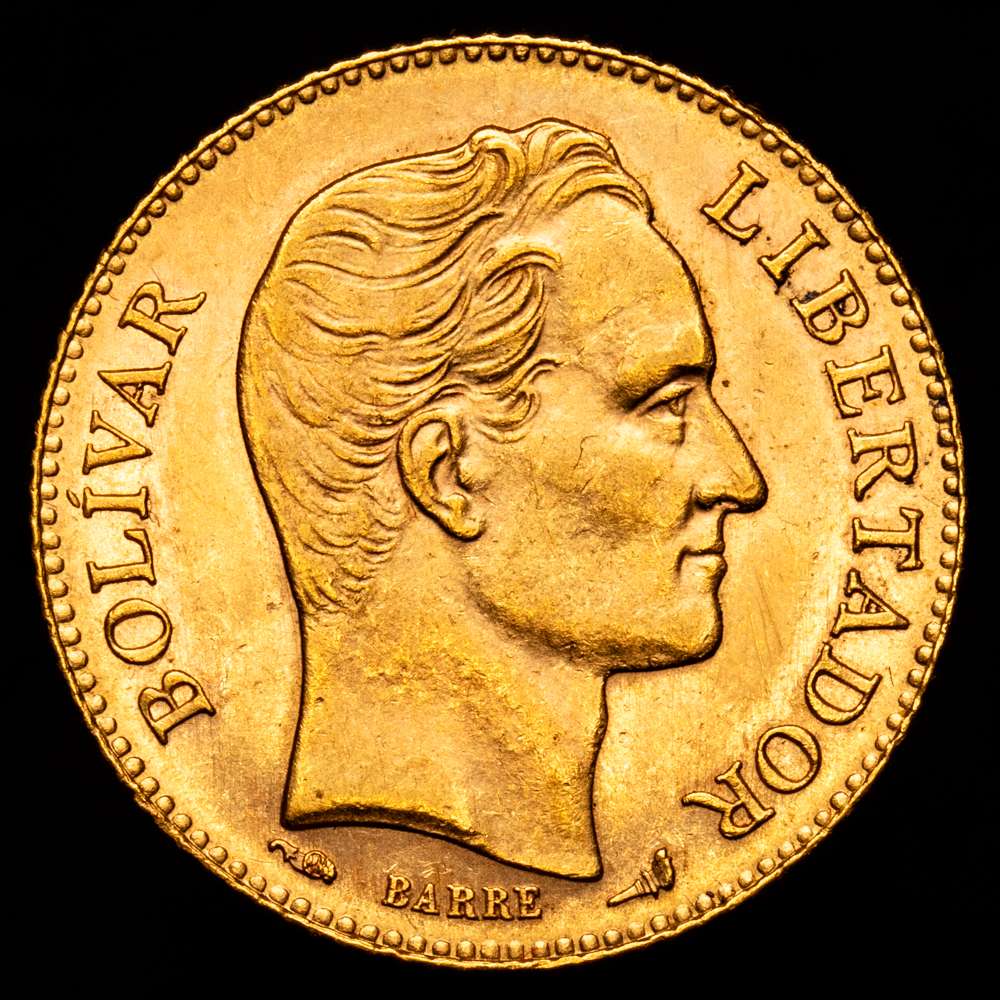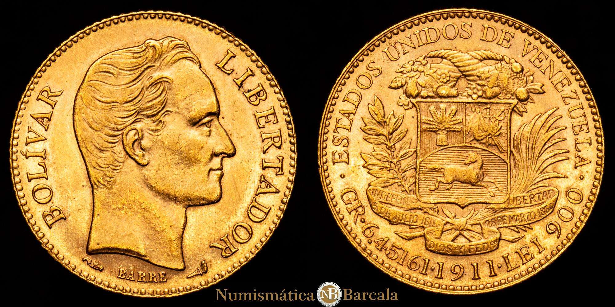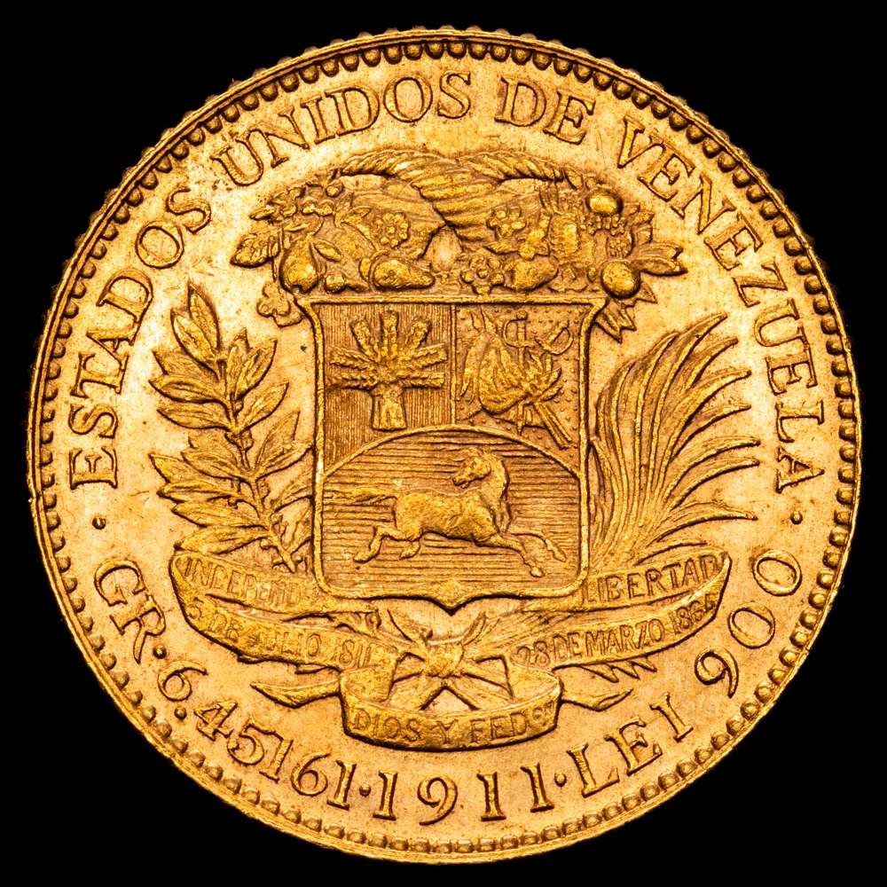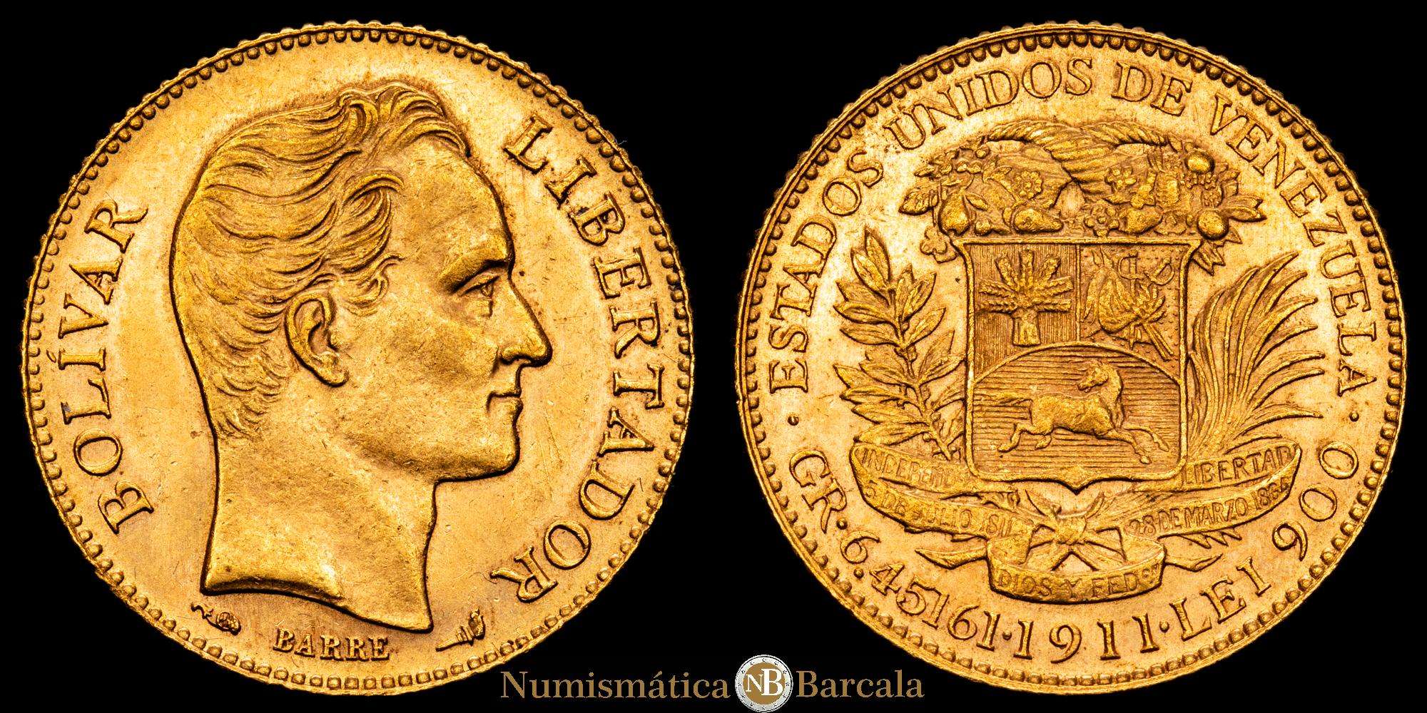 Numismática Barcala > Productos > VENEZUELA: República, AV 20 bolívares, 1911, KM-Y32, Oro (.900) 6,44 gramos. Variedad con punto entre fecha y “LEI” espaciado uniformemente, parte de brillo original, UNC-.