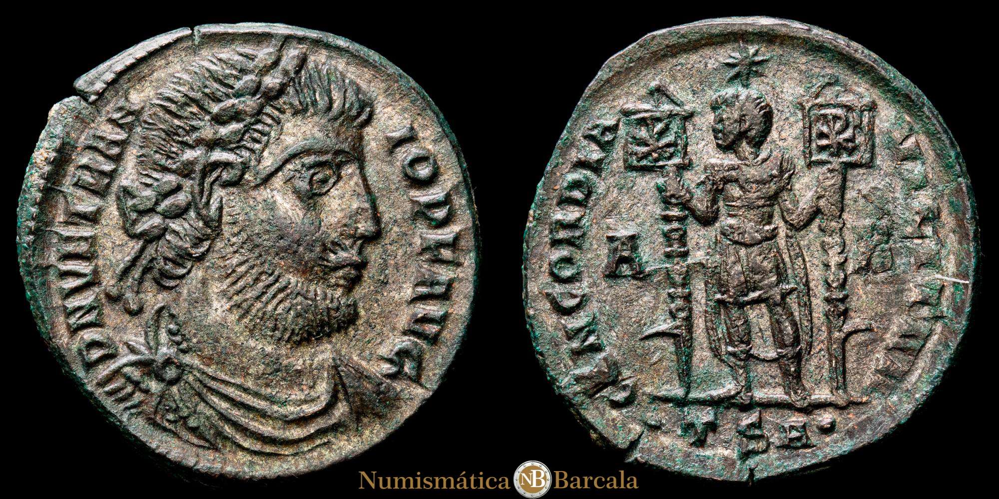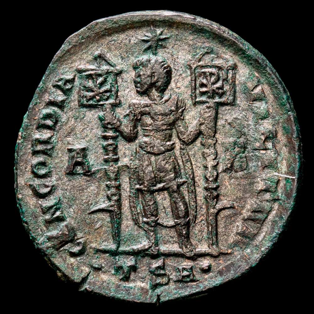 CONCORDIA MILITVM. Emperador en pie de frente, mirando a la izquierda, sosteniendo dos estandartes con crismón en las banderolas, estrella arriba; A-A en los campos, •TSA• en exergo.